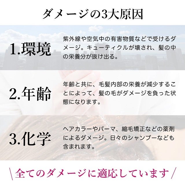 ダメージを受け破壊された毛髪内部のタンパク質は、外部から補修をしてあげないとうねりやごわつきの原因になります。