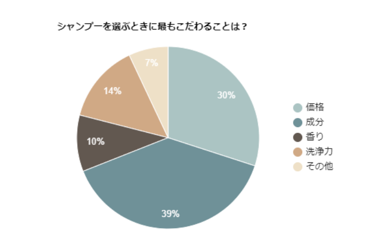 一番多かった回答は、「成分」で39%でした。皆さん、自分の髪の理想として「サラサラにしたい」とか「ハリツヤを目指したい」といったものがあるのではないでしょうか。その理想に近づけるため、成分はしっかり見ているということがわかりました。