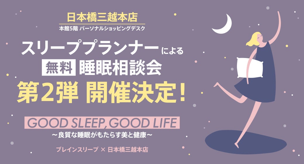 株式会社ブレインスリープ(本社:東京都千代田区、代表取締役:道端孝助)は、伊勢丹新宿店に続き、日本橋 三越本店と3月 9 日(水)より睡眠課題を改善する「GOOD SLEEP,GOOD LIFE~良質な睡眠がもたらす 美と健康~」を共同で開催します。
