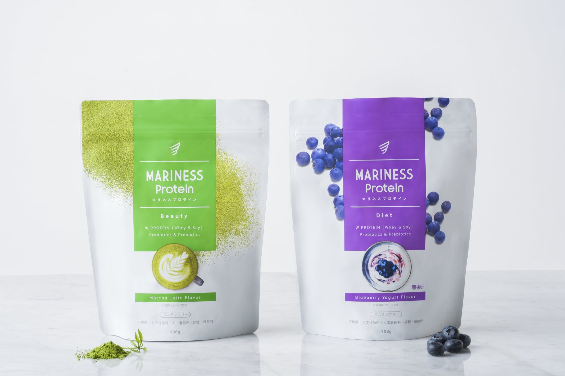 キレイをサポートするビューティーラインの「抹茶ラテ」は、抹茶の風味を感じながら牛乳のラテ感により飲みやすい味となっています。ボディメイクをサポートするダイエットラインの「ブルーベリーヨーグルト」は、ブルーベリーの果実感とヨーグルトの柔らかな酸味のバランスにこだわっています。マリネスプロテインは、今回新たに登場する2種類のフレーバーを加えた、6フレーバーでの展開となります。