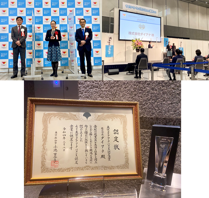 プロポーションづくりの総合コンサルティング企業、株式会社ダイアナ(東京都渋谷区、代表取締役社長 兼 会長: 徳田充孝、以下ダイアナ)が、2022年2月に東京都が選定する「東京ライフ・ワーク・バランス認定企業」に選出され優秀賞を受賞しました。