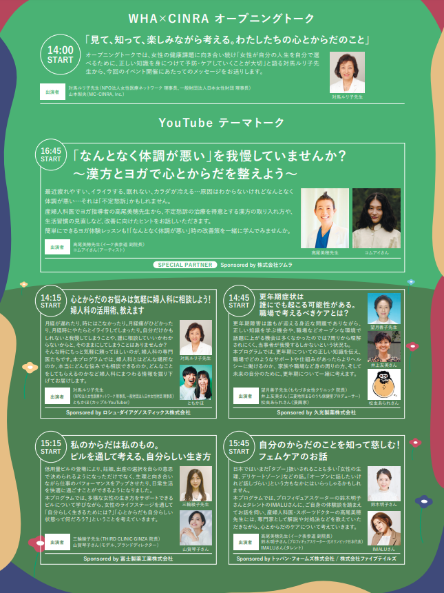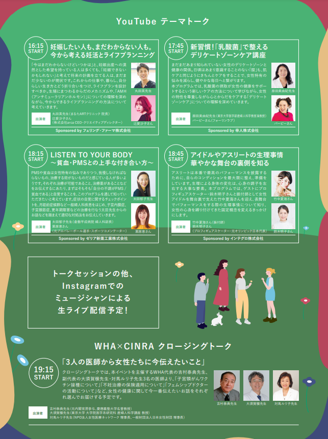 現代日本における女性の健康推進の必要性とその課題について考えるための取組みを行っているWomen’s Health Action実行委員会(代表 慶応義塾大学名誉教授・元内閣官房参与 吉村 泰典)と「人に変化を、世界に想像力を」をミッションに掲げるメディアカンパニーCINRA(本社:東京都世田谷区、代表:杉浦太一 https://www.cinra.co.jp )が、共にプロデュースする『わたしたちのヘルシー 心とからだの話をはじめよう in Mar. 2022』に協賛いたしました。YouTubeとinstagramで配信するトークコンテンツの内容が公開となりましたので、お知らせいたします。