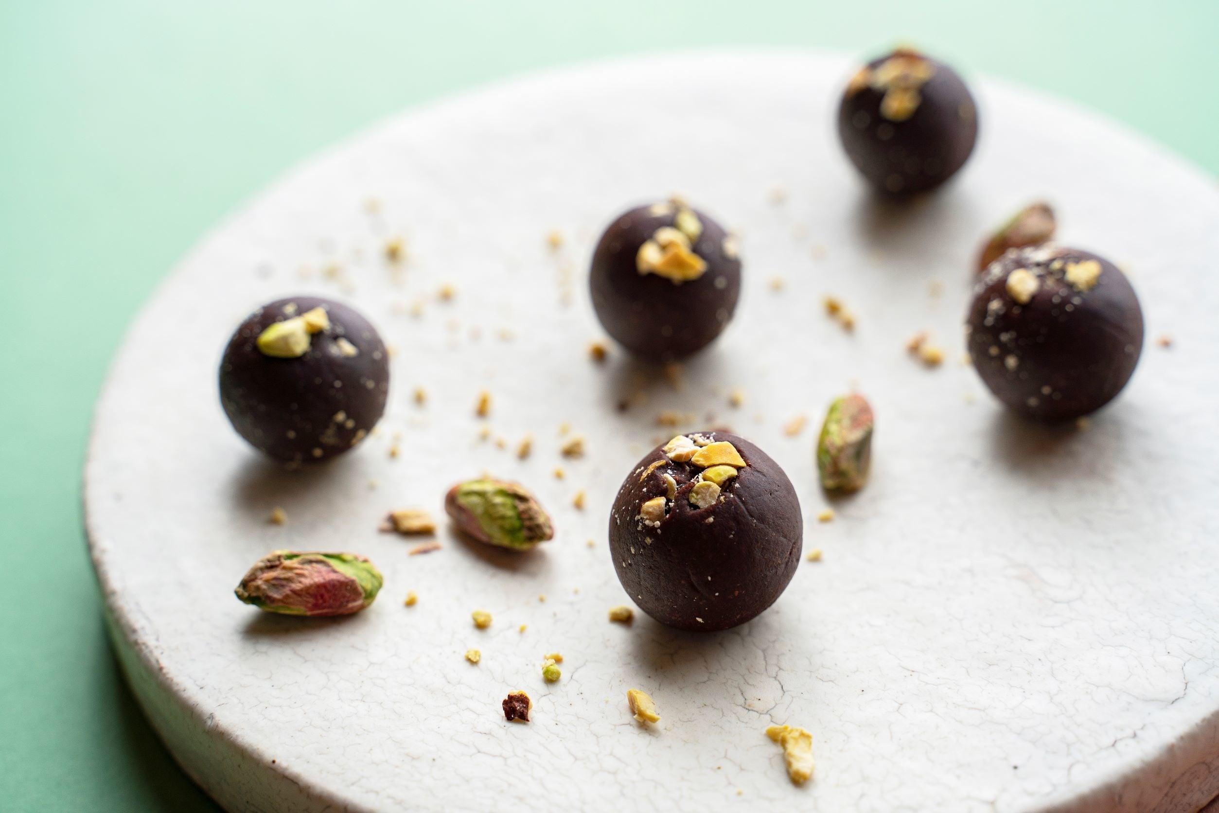 カカオ風味のブリスボールに、香ばしく炒られたクラッシュピスタチオをトップにあしらいました。