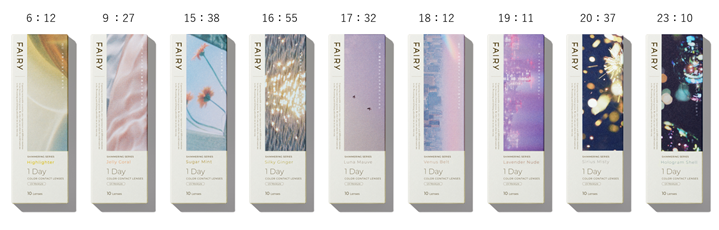 新パッケージは、カラーによって1つ1つデザインが異なります。持っているだけで気分があがり、人に見せた くなるデザインがコレクション性も高めます。また、 24 時間どんなときも、わくわく・キラキラとしたポジティ ブな気持ちになれるように、それぞれのレンズの使用シーンをイメージした時間とストーリーを記載しています。