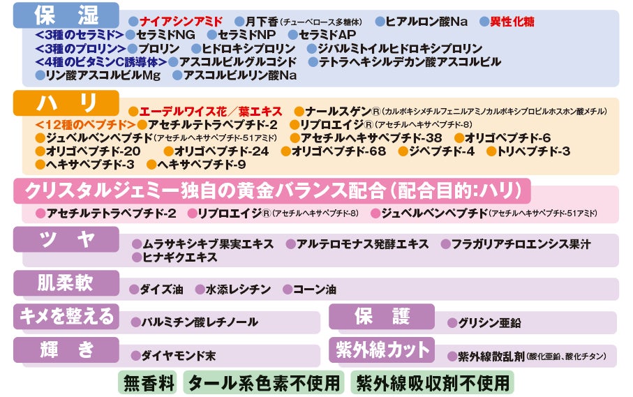 ナールスゲン®※2、3種のセラミド※3、4種のビタミンC誘導体※4に加え、ナイアシンアミド、エーデルワイス花/葉エキスなどの保湿成分を配合。