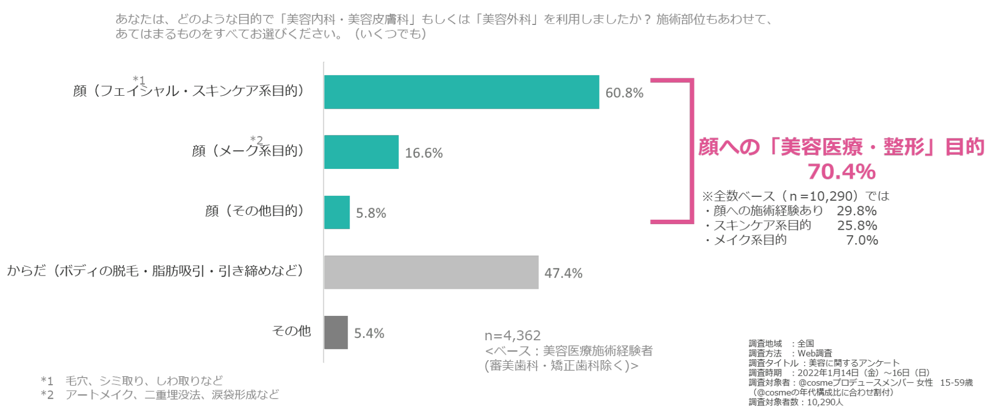 (1)半数が美容医療・整形の経験あり。うち顔への「美容医療・整形」目的が7割強