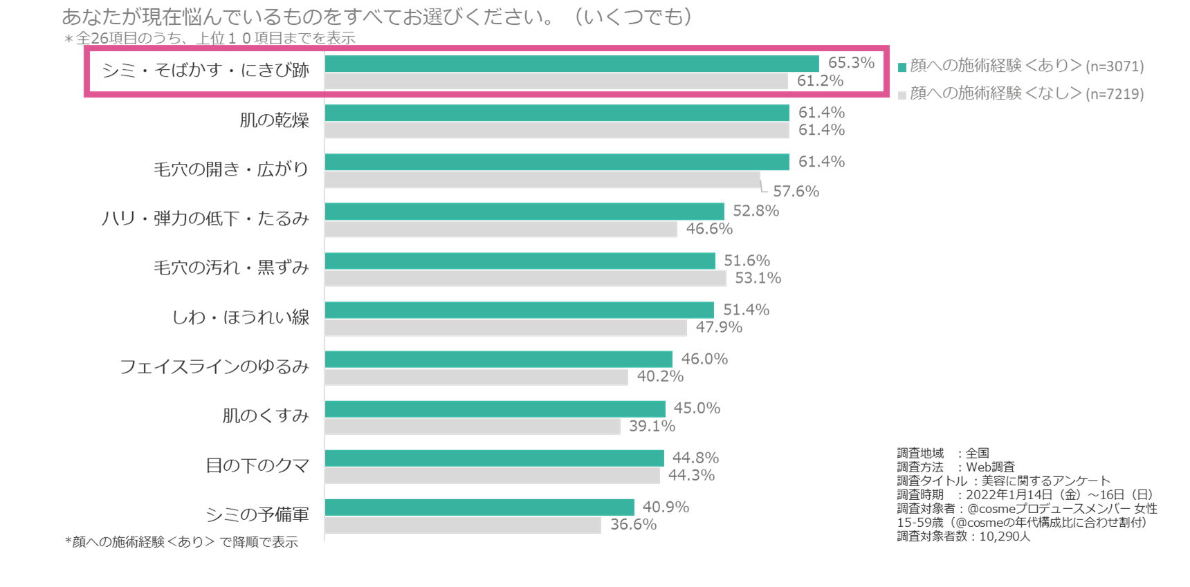顔への「美容医療・整形」経験者に現在の肌悩みを聴取したところ、「シミ・そばかす・にきび跡」が6割半ばと最も高く、「肌の乾燥」「毛穴の開き・広がり」と続きました。