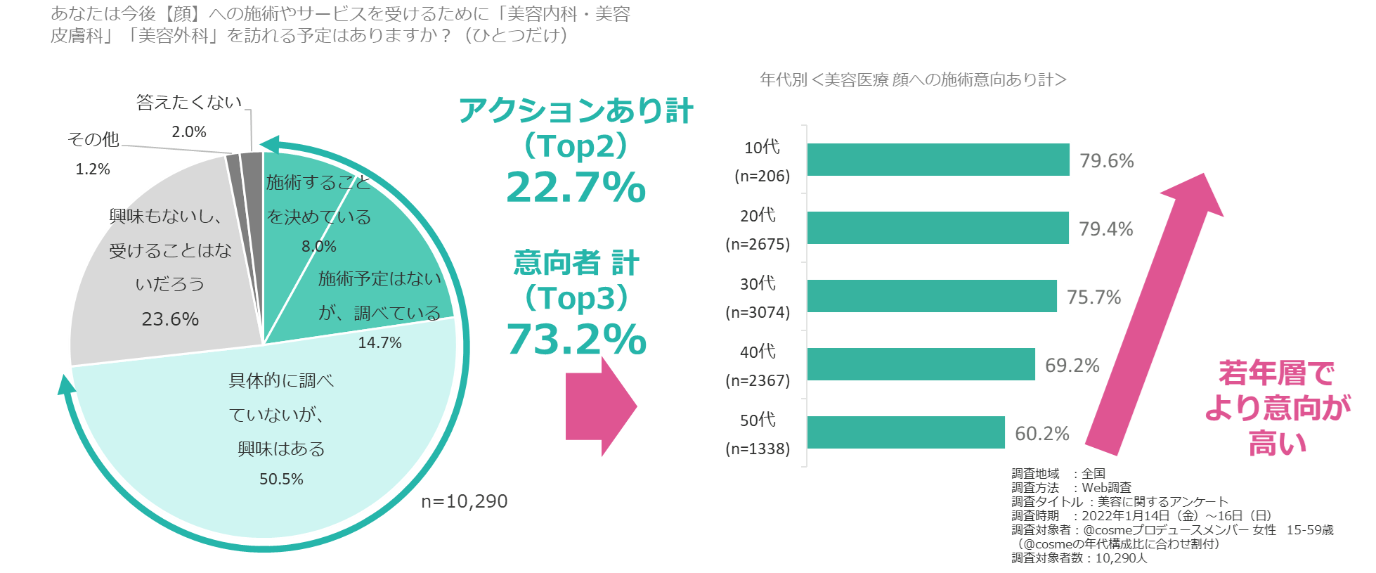 顔への「美容医療・整形」の予定があるか聴取したところ、2割強が「施術することを決めている/施術予定はないが、調べている」と回答しました。また「具体的に調べていないが、興味はある」の回答者を含めると、意向者は7割強となりました。年代別にみると、若年層でより意向が高い傾向が見られました。