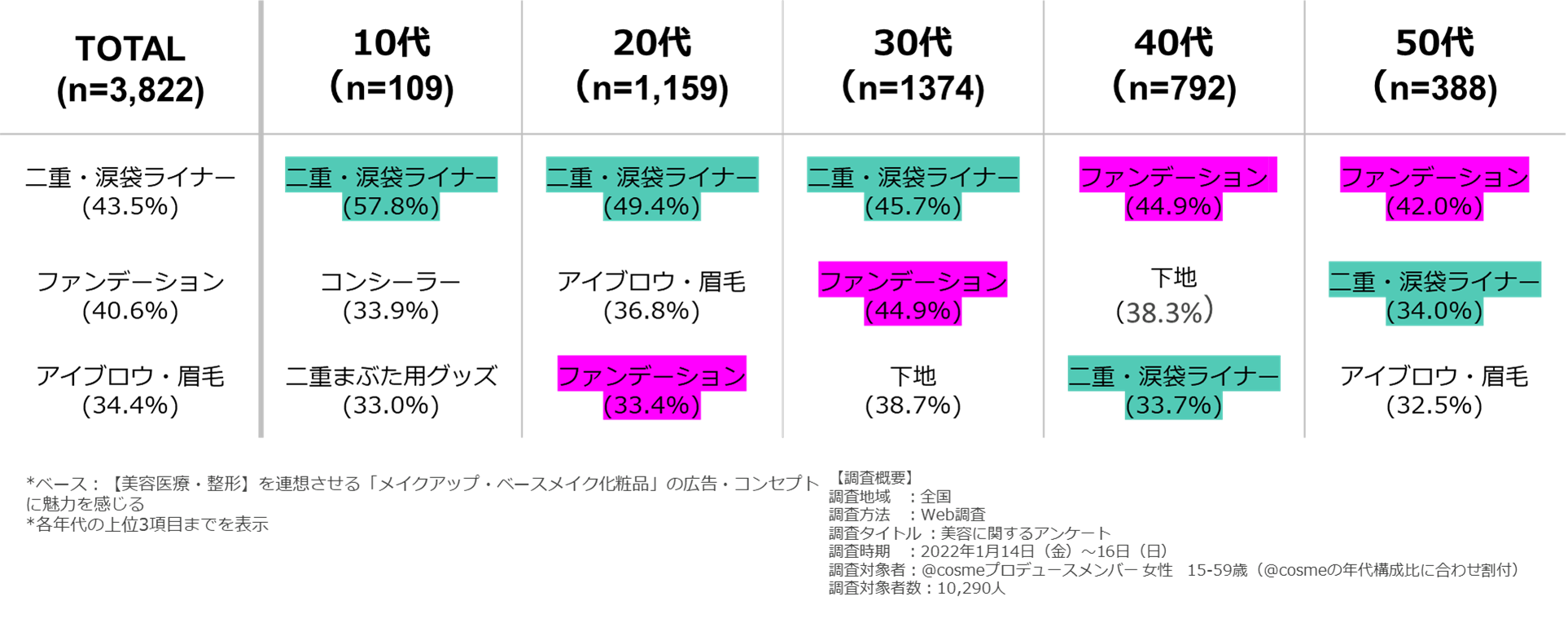 年代別で見てみると、30代以下は「二重・涙袋ライナー」、40代以上は「ファンデーション」が最も高くあげられました。「二重・涙袋ライナー」は、全ての年代で上位3位に入り、「美容医療・整形」を連想させるメイクアップ化粧品として全ての年代に支持されていることが窺えます。