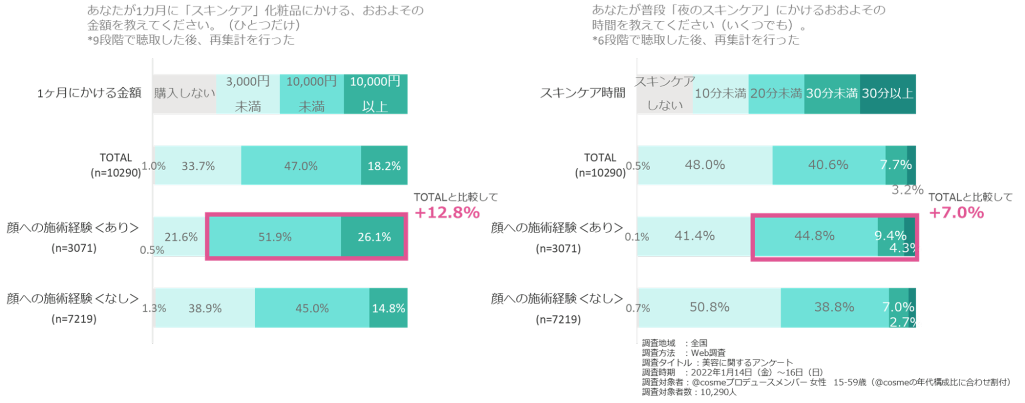 顔への「美容医療・整形」経験者がスキンケアにかける金額・時間は、回答者全体より比較的多い傾向が見られました。スキンケアに1ヶ月にかける金額で「3,000円以上」と回答した人は回答者全体と比較して約12%強高く、同様に、夜のスキンケアにかける時間でも「10分以上」と回答した人が約10%弱高くなっています。