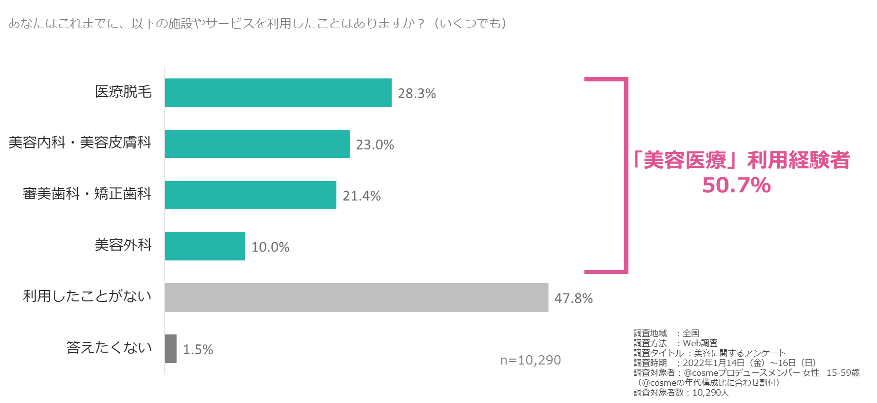 美容医療・整形を施術する施設やサービスを利用したことがあるか聴取したところ、約半数が利用したことがあると回答しました。その中で「医療脱毛」が最も高く挙げられました。