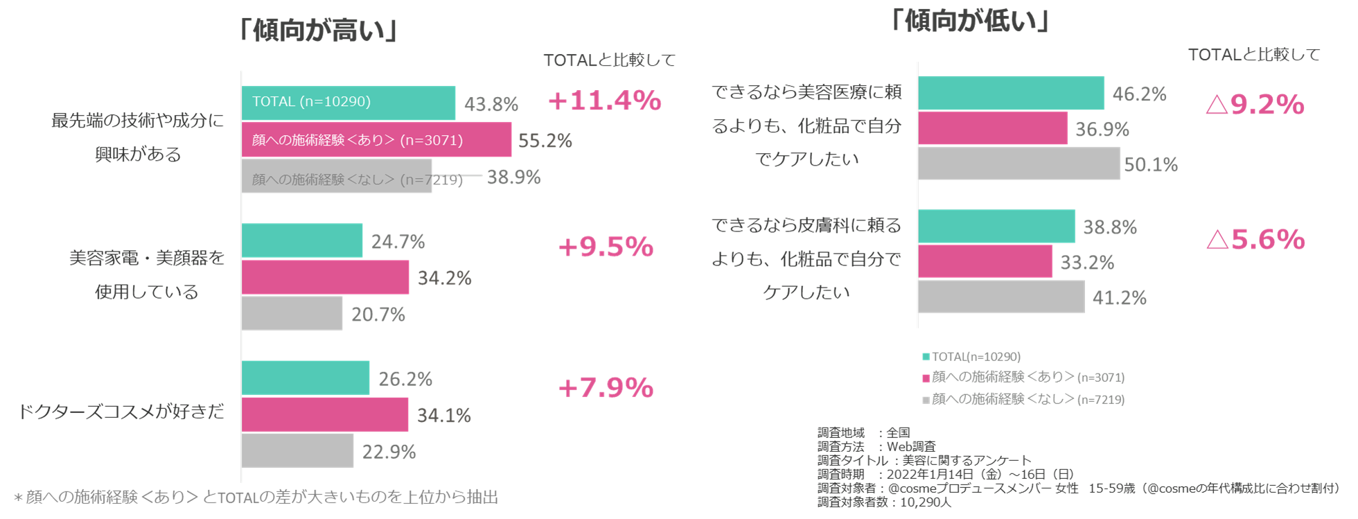 回答者全体と比較してみると、「最先端の技術や成分に興味がある」「美容家電・美顔器を使用している」「ドクターズコスメが好きだ」において5ポイント以上高い傾向を示しました。また、「できるなら美容医療に頼るよりも、化粧品で自分でケアしたい」「できるなら皮膚科に頼るよりも、化粧品で自分でケアしたい」は回答者全体と比べると低い傾向を示しました。