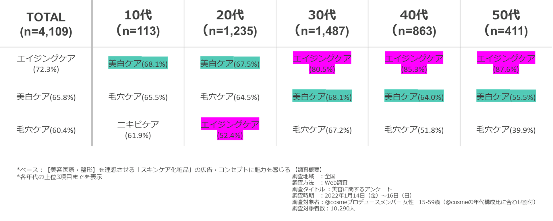 年代別で見てみると、20代以下では「美白ケア」、30代以上では「エイジングケア」が最も高い結果となりました。