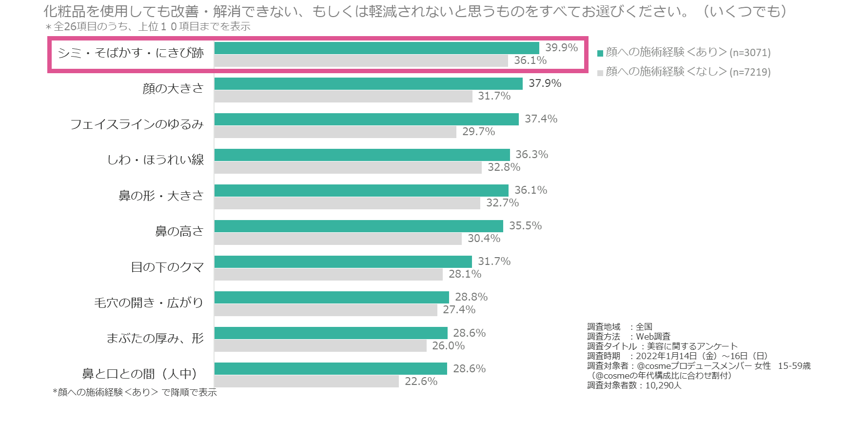 その一方で、「化粧品を使用しても改善・解消できないと思うもの」として最も高く挙げられたのも「シミ・そばかす・にきび跡」となりました。