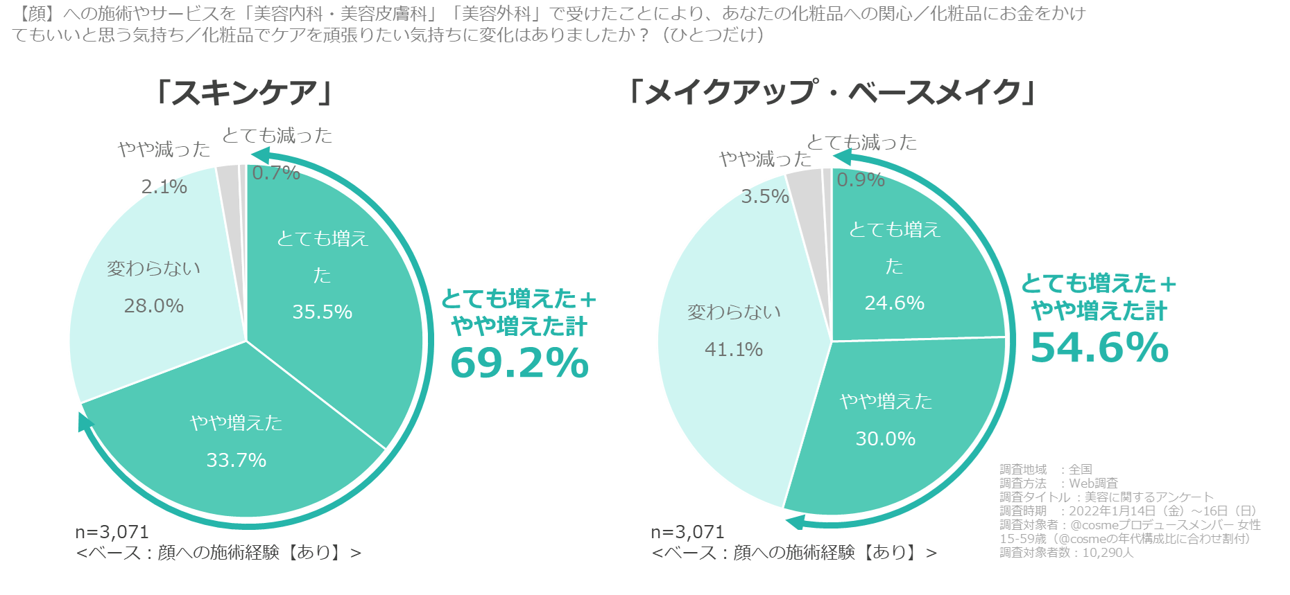 顔への「美容医療・整形」経験者に施術やサービスの利用後、化粧品への関心やお金をかけたいという気持ちに変化があったかどうか聴取したところ、スキンケアで7割弱、メイクアップ・ベースメイクで5割半ばが「とても増えた/やや増えた」と回答しました。
