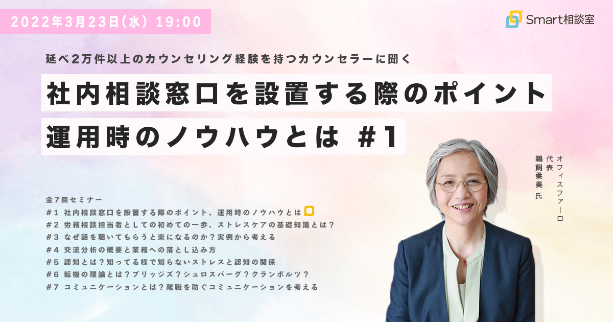 株式会社Smart相談室(本社:東京都港区、代表取締役:藤田康男)は、企業で活躍されている社内相談窓口担当者様向けに、社内相談窓口を設置する際のポイント、運用時のノウハウがわかる無料オンラインセミナーを実施します。第1回は、鵜飼柔美さんによる「延べ2万件以上のカウンセリング経験を持つカウンセラーに聞く「社内相談窓口を設置する際のポイント、運用時のノウハウとは?をお届けします。また、本セミナーは、鵜飼柔美さんと共に全7回として開催されます。