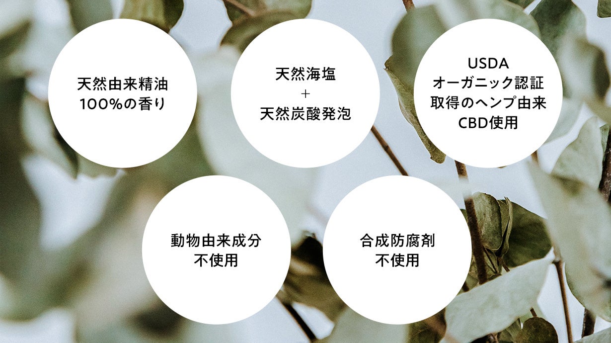 こだわりのCBD成分に加え、天然海塩・天然炭酸発泡を使用。その他、天然由来精油100%の香りなど、製品のメインとなる成分はすべて天然由来で構成しています。