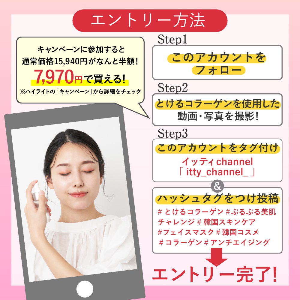 本製品を使用した動画や写真を撮り、Instagramで指定のハッシュタグをつけて投稿するだけで簡単にご応募いただけます。また、ご投稿いただいた方の中からグランプリを選ばせていただきます。当選された方は、Amazonギフト券ととけるコラーゲン(※)パッチ&ミストをプレゼントいたします。本キャンペーンは参加者全員特典でとけるコラーゲンパッチ(※)&ミストが半額で購入できますので、たくさんのご応募お待ちしております。