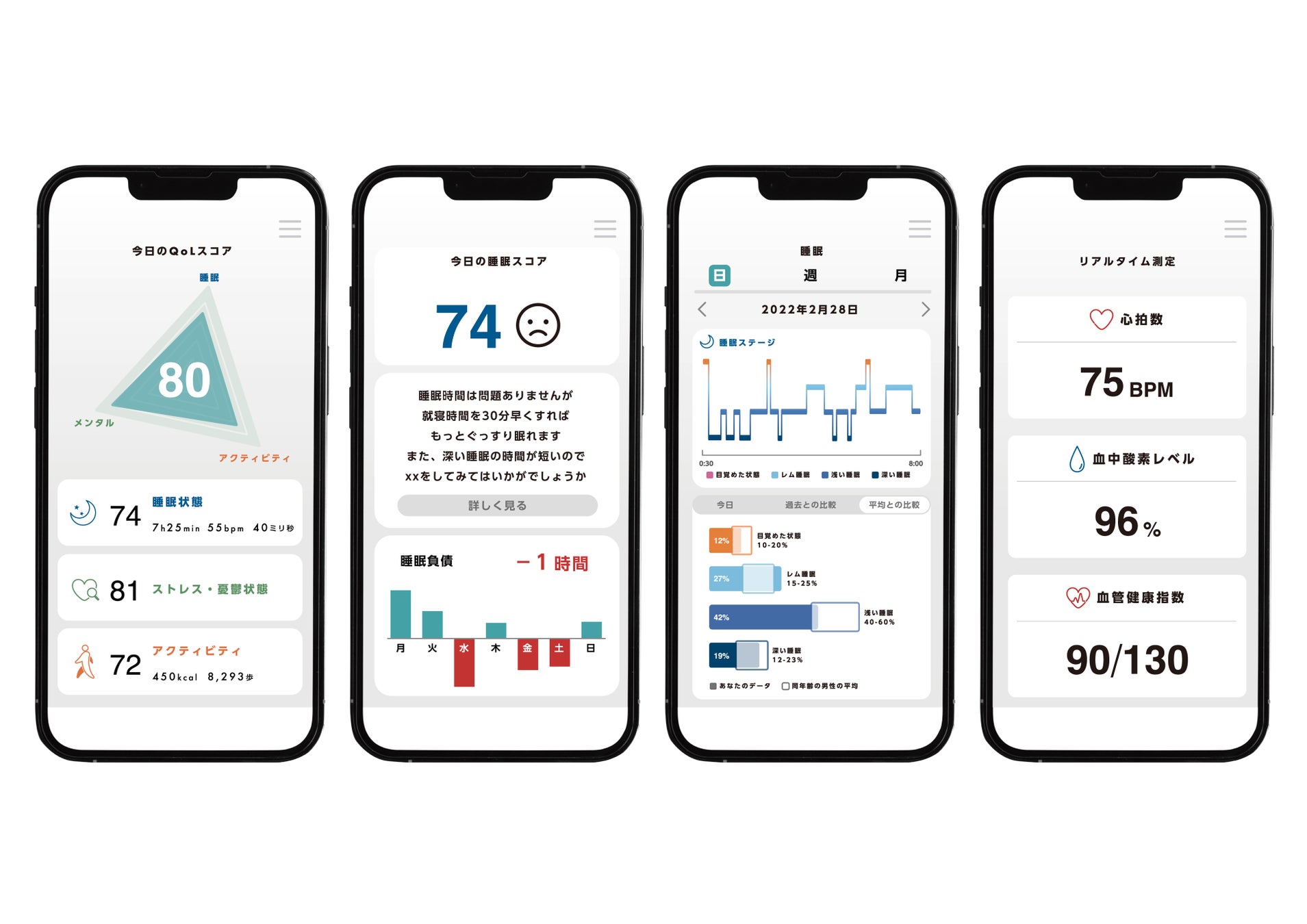 SOXAI Ringは、特に睡眠分析に強みを持っており、睡眠時間や入眠までの時間、睡眠時の呼吸の乱れ、寝返り回数など、睡眠状態を知るためのさまざまな情報を得ることが可能です。また、各指標はスコア化して見ることができ、すべての指標を含めたQoLスコアの算出や、心拍数、血中酸素レベル、血管健康指数のリアルタイム測定機能も搭載されています。