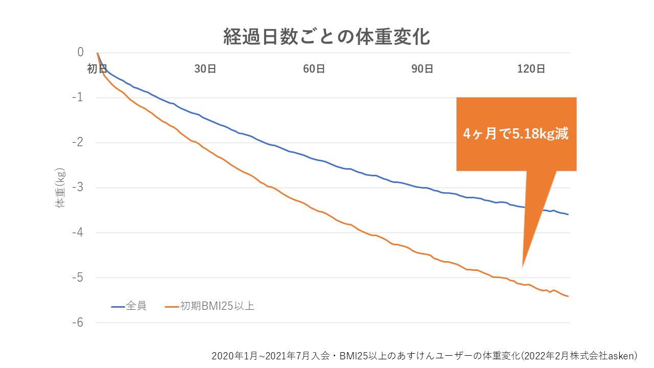 国内No.1食事管理アプリ(※1)「あすけん」を開発・運営する株式会社asken(東京都新宿区、代表取締役社長 中島洋、以下「当社」)は、3月4日の世界肥満デー(※2)に、2020年から2021年に「あすけん」に入会した肥満傾向にあるユーザー(BMI25kg/m²以上、以下「BMI25以上」)約70万人の体重変化について記録データの集計を実施。上記ユーザーのみなさまが、4カ月で平均5.18kgの減量に成功していることがわかりました。また、「あすけん」利用開始時にBMI25以上だったユーザー539名のアンケート結果より、体重の減少だけでなく思考や行動面でもプラスの変化がでていることが明らかになりました。
