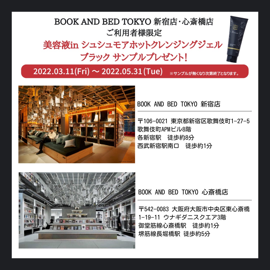 創業136年、株式会社桃谷順天館(ももたにじゅんてんかん)のジュネフォース事業部は、新製品「シュシュモア ホットクレンジングジェル<ブラック>」の商品サンプルを、“泊まれる本屋”として話題のホステル『BOOK AND BED TOKYO』にて期間限定で配布するキャンペーンを実施します。
