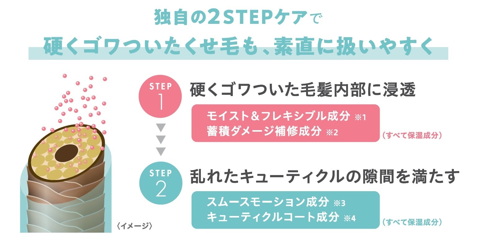 モイスト&フレキシブル成分※1と、蓄積ダメージ補修成分※2(すべて保湿成分)配合。硬くゴワついた毛髪内部に浸透します。