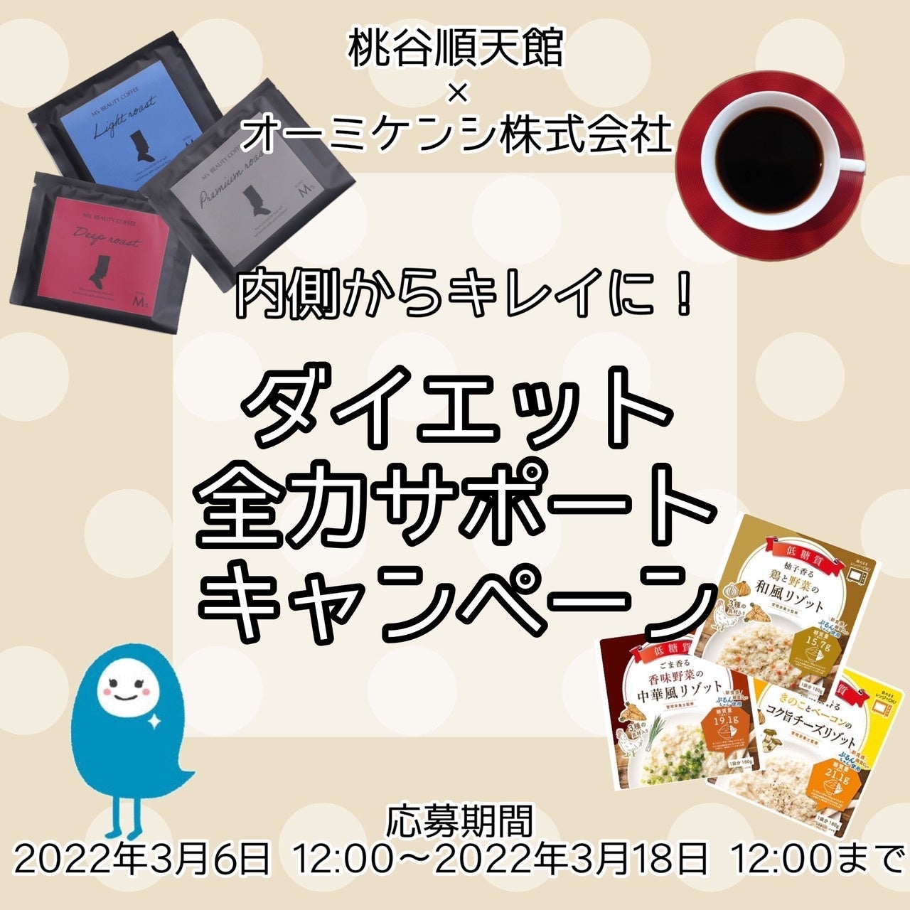 創業から136年、美と健康を追求しつづけてきた桃谷順天館グループ(本社:大阪市中央区、代表取締役社長:桃谷誠一郎)は、オーミケンシ株式会社(本社:大阪市中央区、代表取締役社長:石原美秀)とのコラボレーション企画として3月6日「スリムの日」を記念した“ダイエット全力サポートキャンペーン”を実施いたします。新たな出会いが増える春に向けてコロナ太りを解消したい人のために、桃谷順天館が開発した腸内フローラを整え内側からアプローチする“フローラコントローラISR” 配合の「M’s Beauty Coffee」と、低カロリーかつ食物繊維が豊富なオーミケンシの「ぷるんちゃん低糖質リゾット」をセットにし、公式Twitterをフォロー&リツイートしてくれた方の中から抽選でプレゼントいたします。応募期間は2022年3月6日(日)12時~3月18日(金)12時まで。