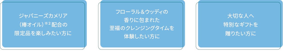 限定商品の「カモマイル サンプチュアス クレンジングバター ジャパニーズカメリア」には、美容成分であるジャパニーズカメリア(椿オイル)※2をさらに配合。肌により高いうるおい感やハリ、弾力をもたらします。ジャパニーズカメリア(椿オイル)※2は、荒れがちな肌の状態を穏やかに保つため、敏感に傾きがちな肌にもおすすめです。