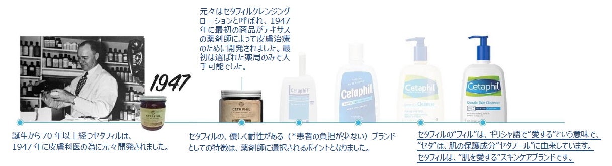 セタフィルは世界70 ヵ国以上で多くのファンに愛されている敏感肌用スキンケアブランドです。70 年以上前の1947 年アメリカ・テキサスで、一人の薬剤師が、皮膚の治療を受けている患者さんのために、皮膚にやさしいクレンザー(洗浄剤)を開発。それをきっかけに、乾燥肌・敏感肌のためにさまざまな商品を生み出してきました。