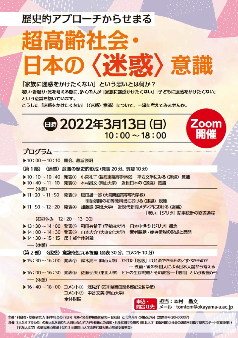 国立大学法人岡山大学(本部:岡山市北区、学長:槇野博史)では、2022年3月13日(日)、科研費・基盤研究A「日本社会の「老い」をめぐる分野横断的研究-「迷惑」と「ジリツ」の観点から」(代表:本村昌文)の中間的な成果を発表するシンポジウム「歴史的アプローチからせまる超高齢社会・日本の〈迷惑〉意識」を下記の要領で開催いたします。