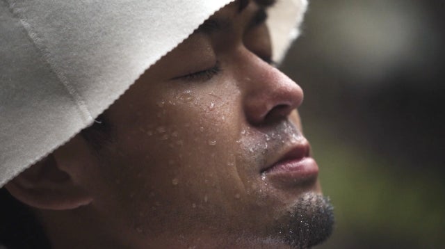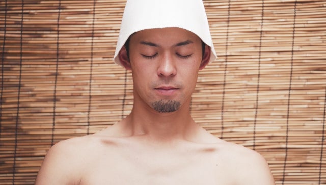 1:サウナを出たら、まずは身体全体をタオルで拭いて、気化熱による急激な体温低下を防ぎます。