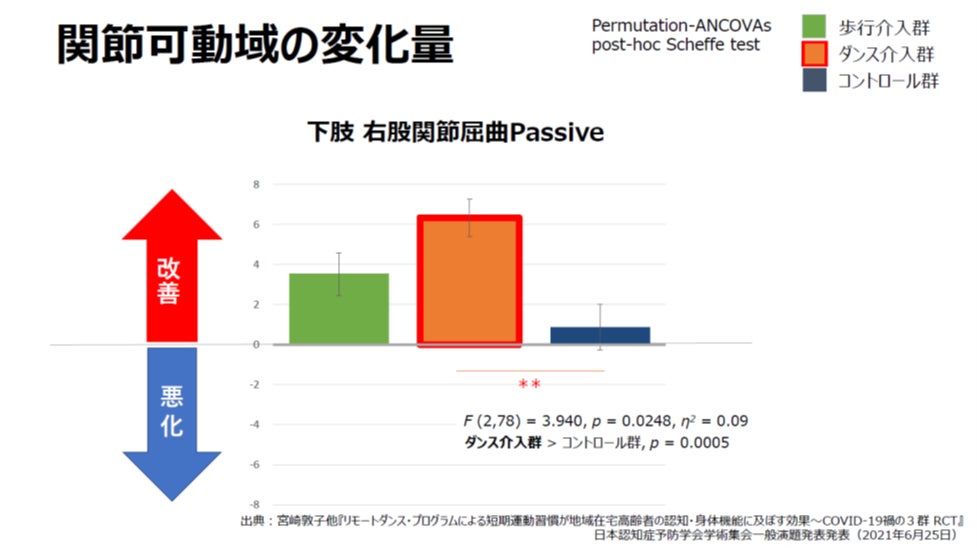 ③何もしなかったグループは認知機能が下がっていたのに対し、①「リバイバルダンス」を行ったグループは認知機能の改善が見られました。