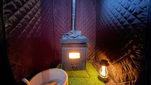 テントとストーブは5分ほどで組み立て可能、ゼロ距離でサウナに入ることを実現します。