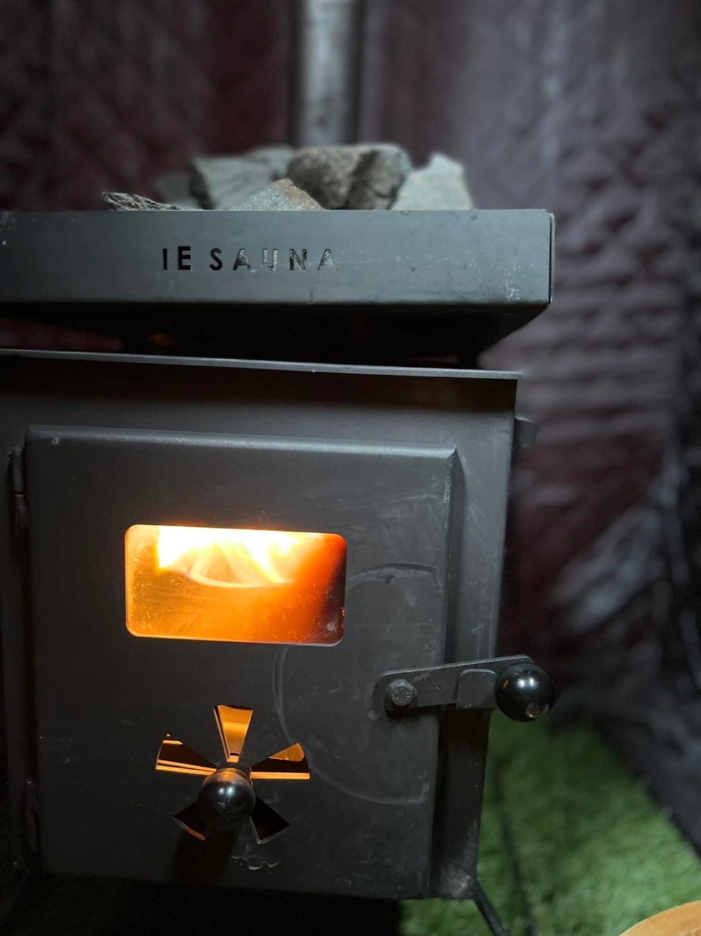 バイオエタノールを燃料とする特許出願済みのストーブで、無煙のサウナを実現しました。