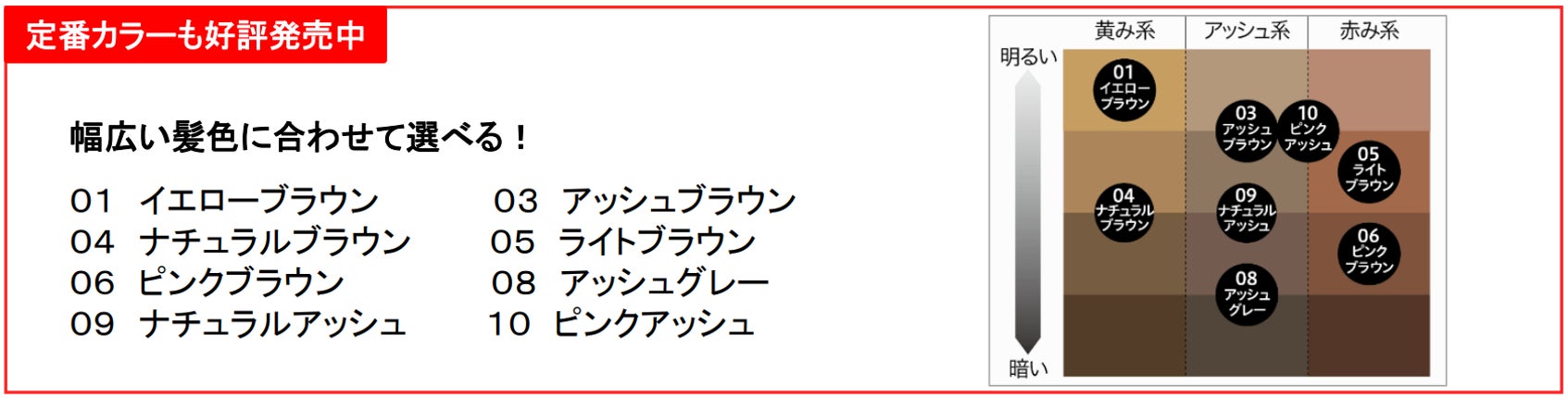 ちょっぴり個性的で、さりげなく色っぽい印象のラベンダーアッシュと、おしゃれでヘルシーな印象の温もりあふれるアプリコットブラウンの2色展開。