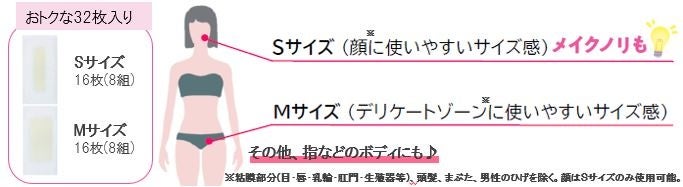 ※ 粘膜部分(目・唇・乳輪・肛門・生殖器等)、頭髪、まぶた、男性のひげを除く。顔はSサイズのみ使用可能。