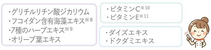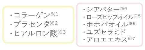 ※1 コラーゲン・トリペプチド F ※2 プラセンタエキス(1) ※3 ヒアルロン酸ナトリウム(2) ※4 シア脂 ※5 ローズヒップ油 ※6 ホホバ油 ※7 アロエエキス(2) ※8 海藻エキス(1) ※9 ツボクサエキス、オウゴンエキス、イタドリエキス、カンゾウエキス、チャエキス(1)、ローズマリーエキス、カモミラエキス(1) ※10 テトラ2―ヘキシルデカン酸アスコルビル ※11 天然ビタミンE