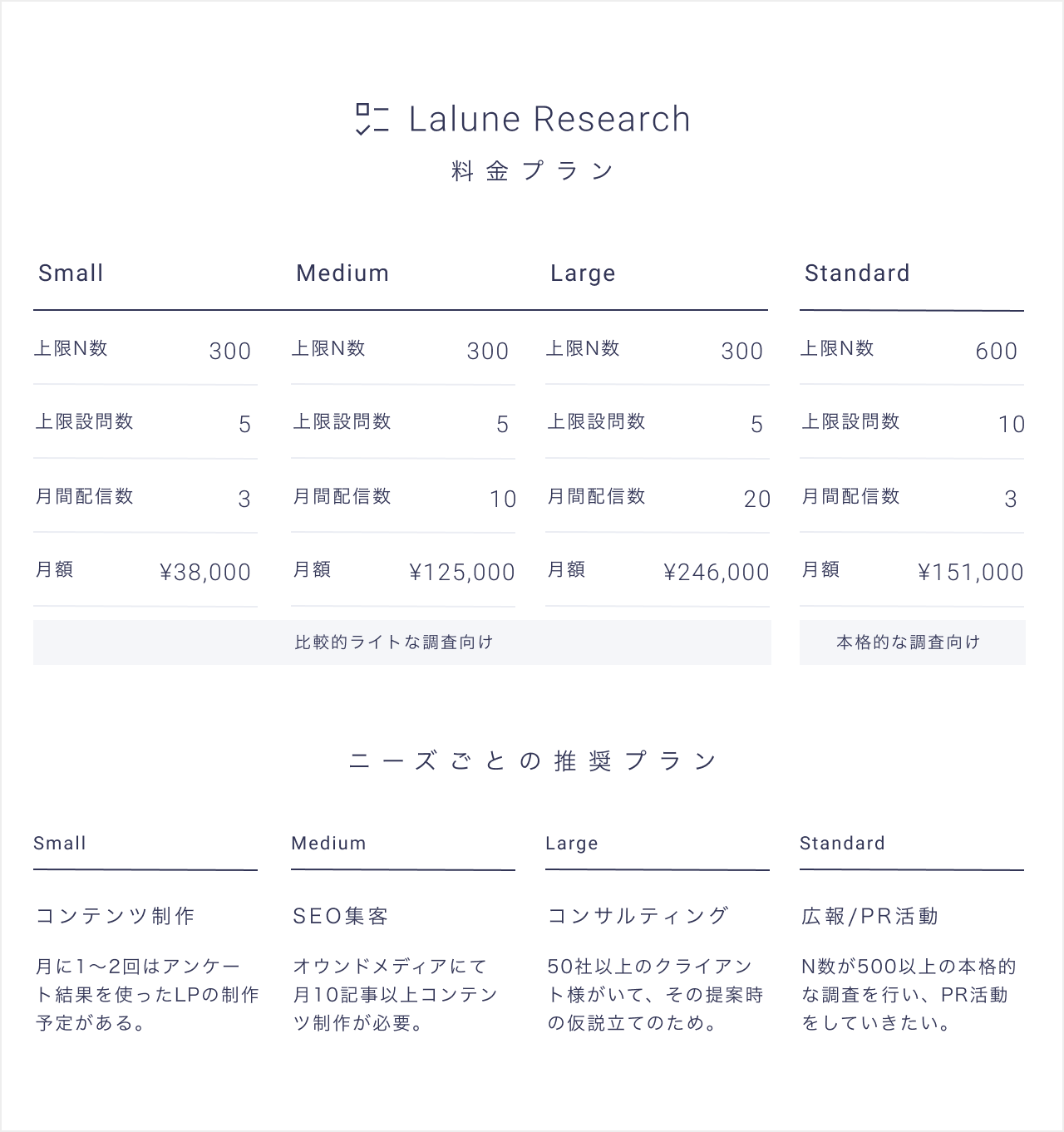 『ラルーンリサーチ』で取得できるアンケート結果は、「1ヵ月で何回かアンケートを取得したい」「できるだけ早く、仮説検証を行いたい」「広告で利用する際のエビデンスが欲しい」などのニーズを満たし、企業の多様なニーズにもお応えします。