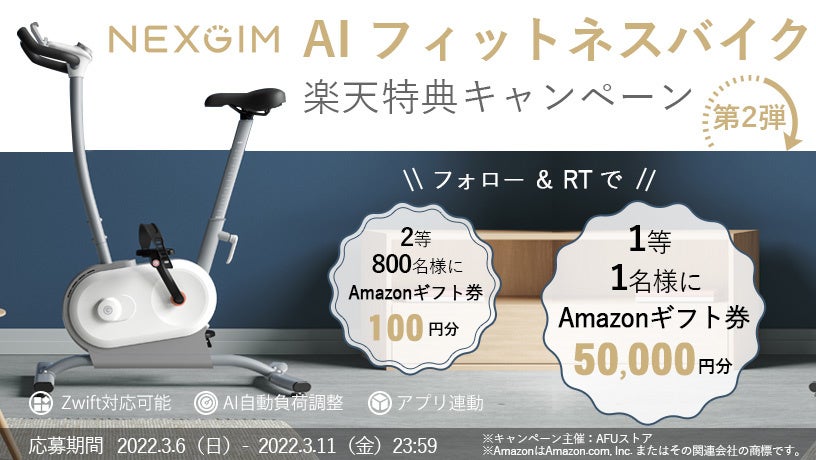楽天で販売中のNEXGIM MG03 AIフィットネスバイクについて、2022年3月6日12:30よりAFUストアのTwitter公式アカウントで、最大5万円分のAmazonギフト券が当たる「楽天特典キャンペーン」第2弾を開催しました。