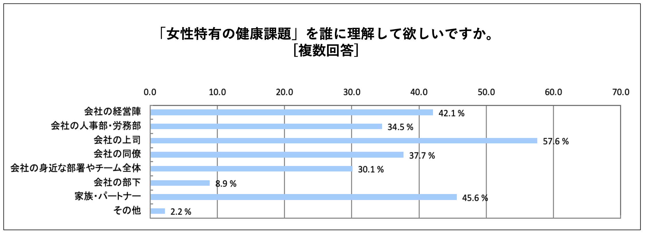 - 女性特有の健康課題を理解して欲しい相手として最も多く選ばれたのは、会社の上司(57.6%)。家族・パートナー(45.6%)を上回る結果に