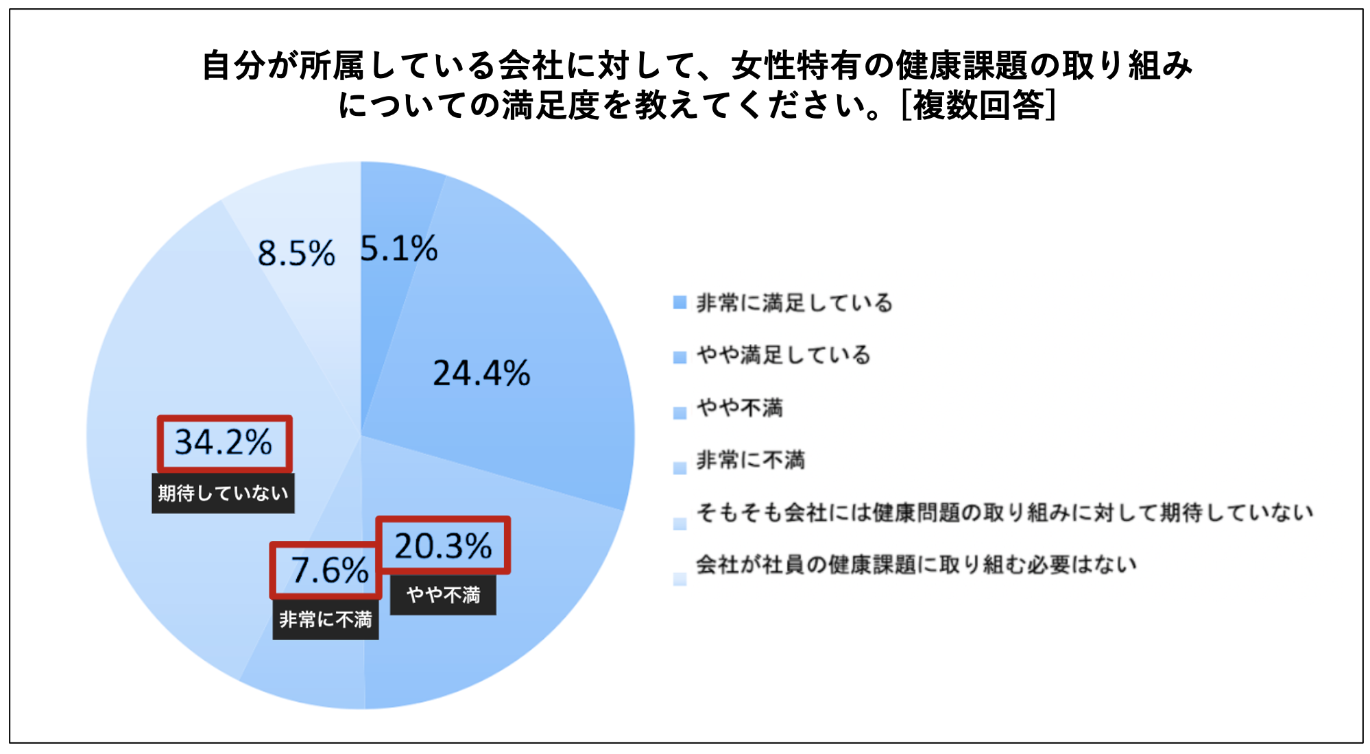 「所属している会社に対して、女性特有の健康課題の取り組みについての満足度について」質問したところ、満足しているのは3割のみで、3割が不満、3割以上が会社に期待していないといった結果となりました。会社の現状に対して、多くの人が不満や諦めを持っていることがわかります。