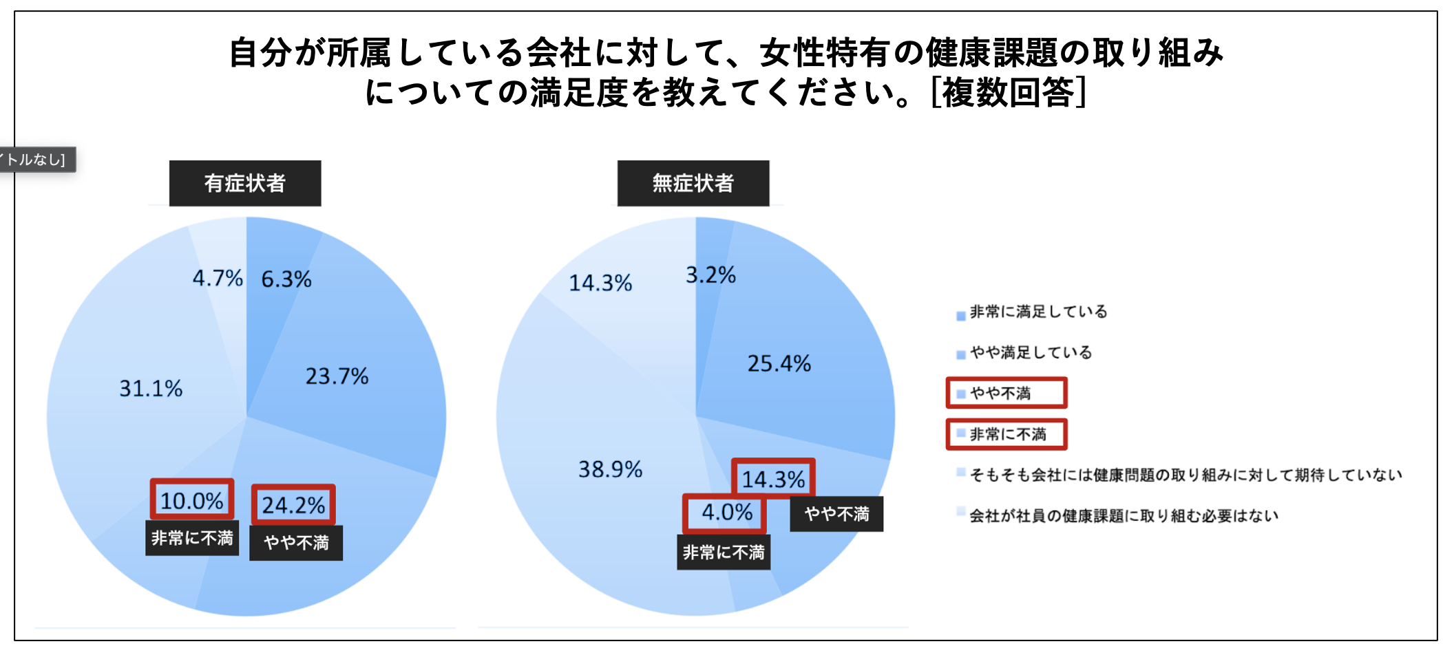 また、有症状者*と、無症状者に分けて分析すると、有症状者は、不満(やや不満・非常に不満)である割合が34.2%と、無症状者の18.3%の約2倍多く、無症状者は会社に期待していない人が38.9%と多い結果となりました。無症状者は自分の症状に気づいておらず不満が少ないものの、無症状者こそ予防が遅れる可能性があり企業が女性自身に気づきを促す仕組みなどの体制整備を考える必要もあります。