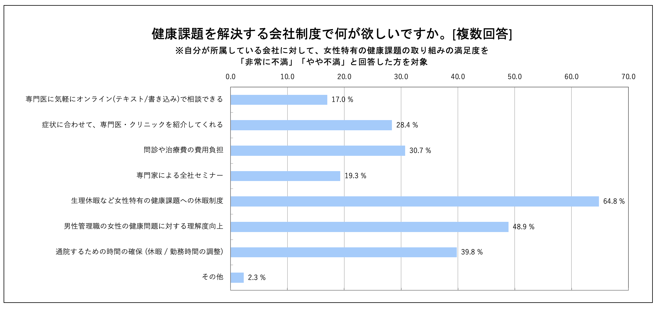 企業の対策としては様々な方法が考えられますが、女性が症状を自覚した際に休むことを奨励するだけではなく、通院などのサポートにより、休まなくても良い状態を作る予防的観点からの対策への要望も目立つ結果となりました。