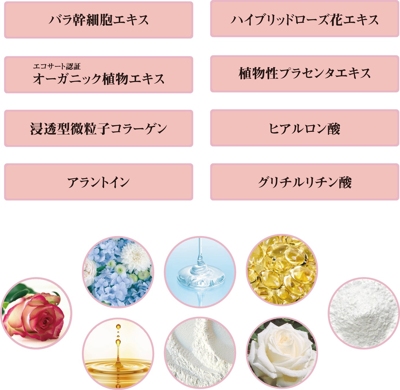 そして生まれたのが、”塗るだけ”でエステトリートメント効果を実現するスペシャルトリートメントコスメ。美しい素肌を保つ栄養素がつまったオーガニック認証成分と、厳選エイジングケア成分を高濃度で配合しました。全製品にバラ幹細胞エキス、ハイブリッドローズ花エキス、リンゴ幹細胞エキス、セイヨウサンザシエキス、ビルベリー葉エキス、キハダ樹皮エキス、浸透型微粒子コラーゲンなどを配合。また各製品毎に+αの成分を配合しております。