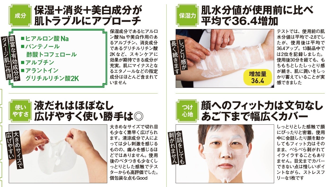 マスク形状が秀逸で顔にぴったりフ ィット。やや厚みがあり開きやすく、初めての1枚には最適です。成分面では保湿成分であるヒアルロン酸Naが保湿力の高さを裏付けています。