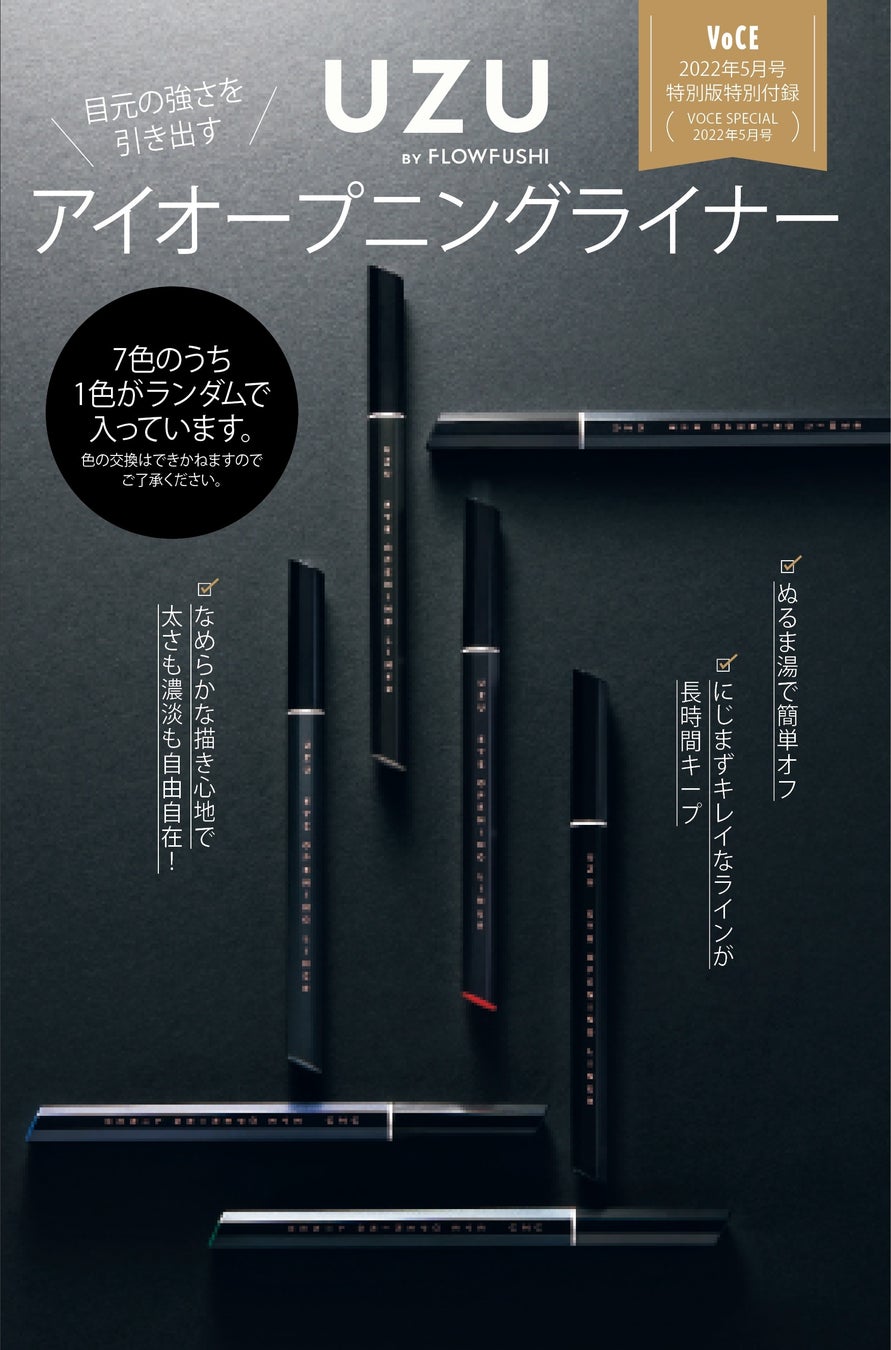 3月22日発売の美容誌『VOCE 2022年5月号 特別版』の特別付録はUZUの「アイオープニングライナー セブン シェイズ オブ ブラック」。ブラック7色のうちランダムで1色があなたのお手元に!