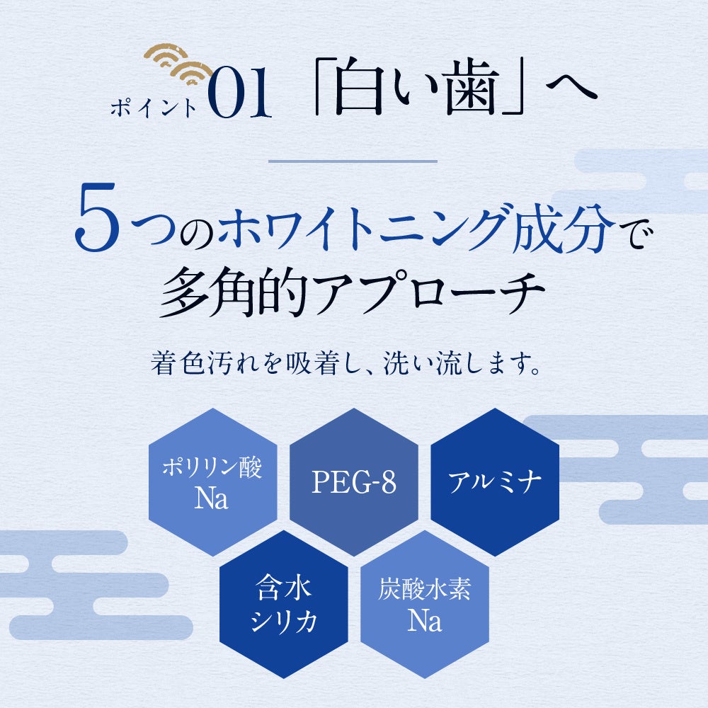 5つのホワイトニング成分で着色汚れを吸し、洗い流します。