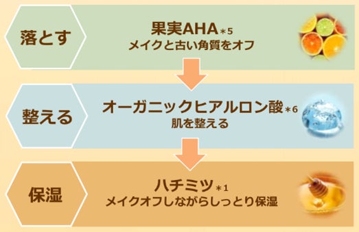 「果実AHA*5」でメイクと古い角質をオフし、 「オーガニックヒアルロン酸*6」で肌を整え、 「ハチミツ*1」でメイクをオフしながらもしっとり保湿を叶えます。