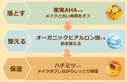 「果実AHA*5」でメイクと古い角質をオフし、 「オーガニックヒアルロン酸*6」で肌を整え、 「ハチミツ*1」でメイクをオフしながらもしっとり保湿を叶えます。