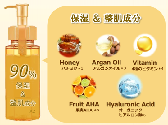 ハチミツ*1やアルガンオイル*3、4種のビタミン*4など、製品の90%以上を保湿·整肌成分(※3) で構成されています。